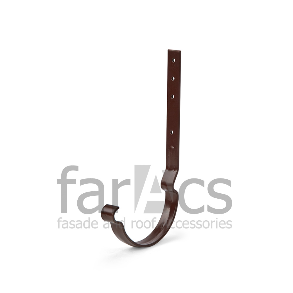 Предназначен для крепления желоба к обрешетке кровли. Длина - 290 мм., толщина стали - 4 мм. Металлическая водосточная система FarAcs изготавливается из высококачественной российской стали толщиной 0,52мм с наивысшим, первым, классом цинкования. На элементы системы нанесено защитно-декоративное полимерное покрытие, разработанное специально для водосточных систем. Желоб имеет увеличенную глубину, что обеспечивает повышенную пропускную способность по сравнению с аналогичными водосточными системами с диаметром желоба 125 мм.