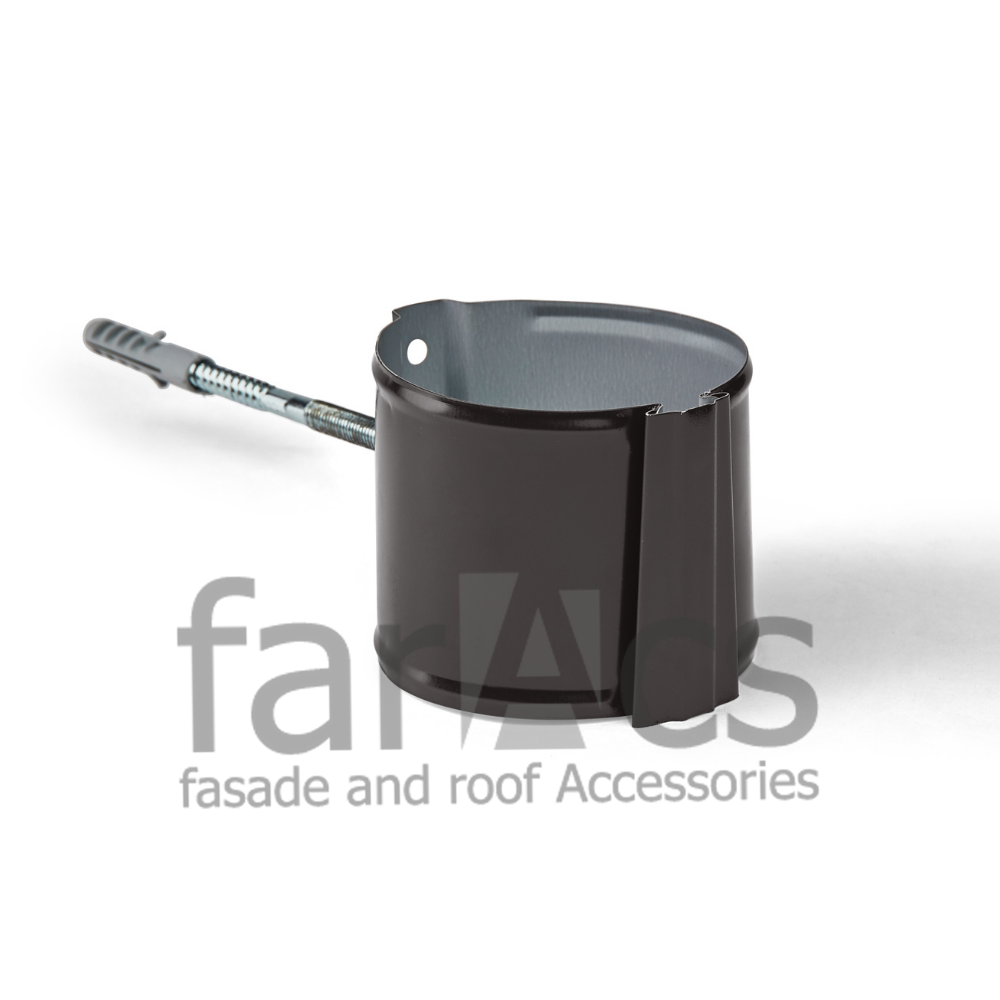 Предназначен для фиксации водосточной трубы к фасаду здания. Применяется на фасадах из твердых материалов (кирпич, бетон, камень). В комплект входит хомут, клин, саморез 8х120мм и дюбель. Изготовлен из оцинкованной стали (Zn I класс) с двухсторонним полимерным покрытием 25 мкм.