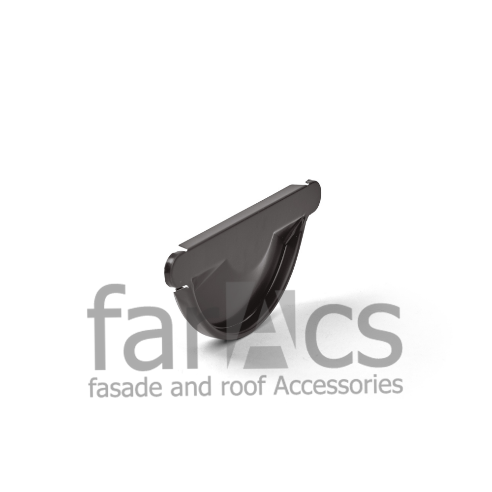 Устанавливается в местах окончания желоба и предотвращает протекание воды за счет плотного уплотнителя. Изготовлена из оцинкованной стали (Zn I класс) с двухсторонним полимерным покрытием 25 мкм. Металлическая водосточная система FarAcs изготавливается из высококачественной российской стали толщиной 0,52мм с наивысшим, первым, классом цинкования. На элементы системы нанесено защитно-декоративное полимерное покрытие, разработанное специально для водосточных систем. Желоб имеет увеличенную глубину, что обеспечивает повышенную пропускную способность по сравнению с аналогичными водосточными системами с диаметром желоба 125 мм.