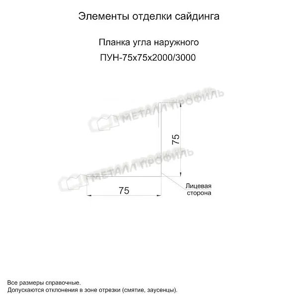 - Планка угла наружного 75х75х3000 (ПЭ-01-1035-0.45) не ржавеет. - Украшает стандартные элементы отделки сайдинга. - Изготавливается в любых цветах декоративно-защитных покрытий. - Обладает стойкостью к ультрафиолету. - Сталь устойчива к деформации. Общая толщина оцинкованного металла с полимерным покрытием 0.45 мм.
