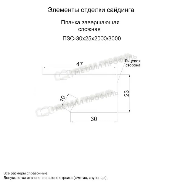 - Планка завершающая сложная 30х25х3000 (ПЭ-01-2004-0.45) не корродирует. - Сталь не деформируется. Общая толщина оцинкованной стали с полимерным покрытием 0.45 мм. - Украшает стандартные элементы отделки сайдинга. - Широкий выбор цветовых решений. - Не выцветает.