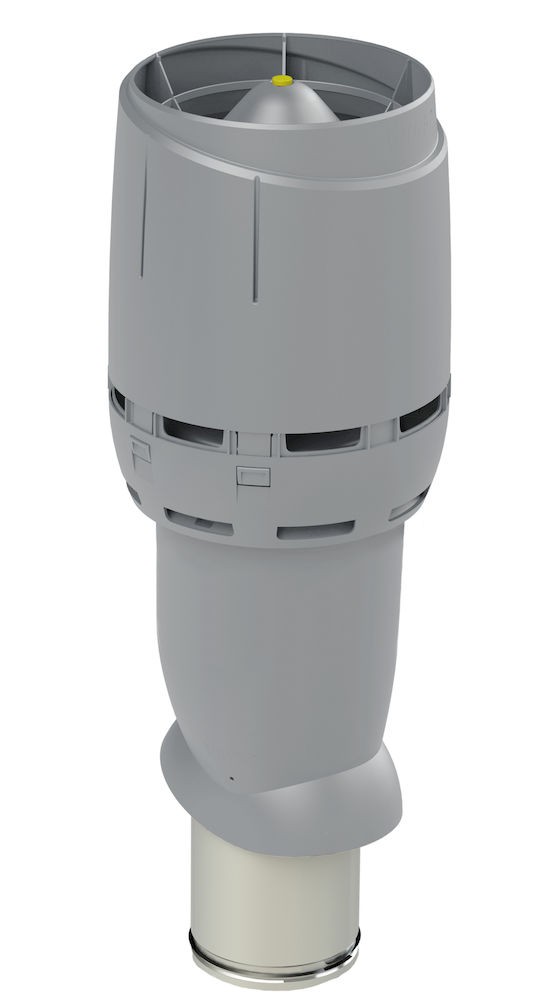 Вентиляционный выход  Vilpe Flow 160/ИЗ/700 изолированный (утепленный) вентиляционный выход увеличенной высоты внутренним диаметром 160 мм. Применяется для вывода через скатную кровлю естественной вентиляции помещений, вентиляции с использованием канального вентилятора, кухонной вытяжки. Внутренняя труба изготовлена из оцинкованной стали. Длина внутренней трубы позволяет вставить ее в подводимый воздуховод на длину 300 мм. Это облегчает вертикальный монтаж в тесных чердачных помещениях и делает конструкцию более прочной. Нижний край внутренней трубы имеет резиновый уплотнитель, герметизирующий соединение трубы и воздуховода.  Вентиляционный выход укомплектован новым улучшенным колпаком Flow, который обеспечивает на до 40% меньше потери давления в системе, лучшую защиту от атмосферных осадков, строго вертикальный поток выходящего воздуха (при использовании с кухонной вытяжкой уменьшается вероятность попадания капель масла на кровельный материал), современный дизайн.  Проходной элемент продается отдельно и подбирается по типу кровельного материала.
